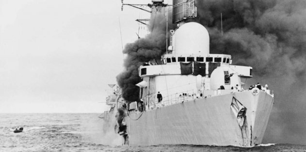 Эвакуация личного состава с горящего десантного корабля Абсолютным примером британских проблем стала самая первая жертва войны — эсминец «Шеффилд». Он был одним из немногих, получивших в этой войне противокорабельную ракету, — это был французский «Экзосет». Вопрос, взорвалась ли боеголовка ракеты или всё началось c воспламенившегося ракетного топлива её двигателя, в свете последующих событий представлял лишь академический интерес. Пожарная магистраль была перебита — её так и не восстановили. Пожарные насосы долго не могли запустить, а вспомогательные насосы не заводились. Корабль быстро наполнился дымом, и после оставления мостика управление борьбой за живучесть было потеряно.