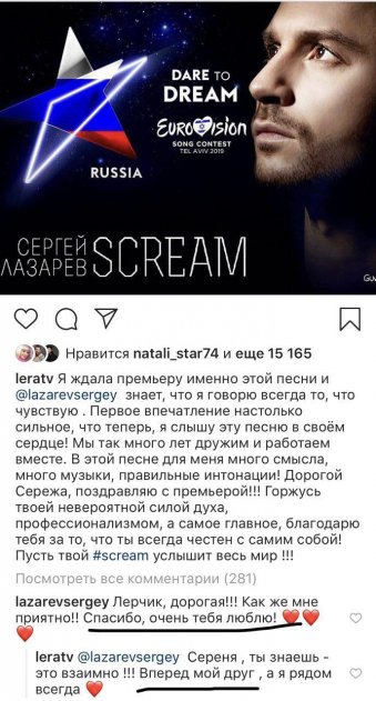 На странице у Леры Кудрявцевой несколько дней назад появилась запись с информацией о премьере песни Сергея Лазарева на Евровидение-2019, под которой телеведущая рассыпалась своему бывшему жениху в комплиментах. Ответ не заставил себя долго ждать - Кудрявцева получила целое признание в любви: «Очень тебя люблю!». На это она ответила взаимностью, но с некой ремаркой, указав, что он ей всего лишь друг.