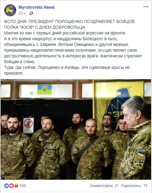 "Многие из них с первых дней российской агрессии - на фронте. А в это время "Нацкорпус" и "Нацдружины" Билецкого в тылу, объединившись с Шарием, беглым Онищенко и другой мразью, прикрываясь националистическими лозунгами, осуществляют свою деструктивную деятельность в интересах врага. Фактически стреляют бойцам в спину. Туда, где сейчас Порошенко и Азовцы, эти сцикливые крысы не приехали", - заявили в "Миротворце".