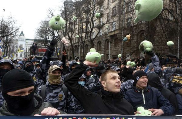 Мудрые люди утверждают, что трагические страницы истории, если и повторяются, то в виде фарса. И неприлично рассказывать, во что превращается трагедия после многократных попыток её повторения. Например, у украинских неонацистов откровенно свербит в каком-то месте, когда они в очередной раз возбуждаются против действующей власти и выходят на центральную площадь Киева, чтобы что-то от неё потребовать. Что и скрывать, повод для выхода на Майдан у нацистов есть: окружение Порошенко покусилось на самое святое для них – разворовывает бюджетные средства, которые власть сдирает с населения по крохам в виде налога на войну в Донбассе. Пикантность ситуации заключается сразу в нескольких нюансах. Во-первых, разворовыванием занимался давний друг Порошенко, заместитель председателя СНБО Олег Гладковский. Во-вторых, Гладковский – это вторая фамилия высокопоставленного чиновника, которого уволил, но не привлёк к суду после скандала Порошенко. Первая – Свинарчук, и на этом строится вся атрибутика нацистов, неделю назад поставивших Порошенко ультиматум: или президент сажает Свинарчука-Гладковского вместе с любимым сыночком, тоже испачкавшимся в кражах, или, как говорил герой советской комедии, «одно из двух». Но вот срок ультиматума истёк, «гарант» его проигнорировал, и настала пора широко разрекламированных «Национальным корпусом» действий по «принуждению» Порошенко. Нужно стало на деле показывать, что значит то самое «или…», о котором так громко орали националисты. Разрекламировали мероприятие с размахом! Фюрер «Нацкорпуса» и «Азова» Билецкий трагически вещал о том, что «кроты» в СБУ принесли страшное известие о планах Порошенко разогнать вышедшее из повиновения национально озабоченное сообщество, подчиняющееся «Белому Вождю» (так требовал называть себя Билецкий ещё в годы руководства организацией «Патриот Украины»). Его побратимы заламывали руки, говоря о тайном приказе на ликвидацию всей азовско-нацкорпусной верхушки. А для придания трагизма пожаловались на то, что СБУ закладывает в центре Киева массу взрывных устройств, чтобы «наехать» на Билецкого наверняка. Накануне событий три тысячи полицейских оцепили «правительственный квартал», а на дорогах, ведущих к Киеву, устроили массовый «шмон» всех автобусов и даже легковушек, какого, как утверждают очевидцы, он «даже во времена тирана Януковича не видывали». Рекламная кампания удалась! 16 марта на Майдан пришли, как говорят организаторы митинга, около 10 тысяч человек. Ну, плюс-минус пять-шесть тысяч… Говорили долго и пламенно! Планировали в ночь на 1 апреля захватить аэропорты и вокзалы, чтобы не дать сбежать Порошенко. Требовали отрубить «руки, які нічого не крали» папе и сыну Свинарчукам. Даже гигантскую рогатку принесли, вроде той, из которой стреляли в 2014 году «коктейлями Молотова». В общем, казалось бы, всё шло к повторению трагедии пятилетней давности. Выяснилось и назначение мега-рогатки. Ею действительно стали стрелять в полицию, бесчисленными рядами перегородившую подходы к резиденции Порошенко. Правда, и в этом проявилось влияние «декоммунизации». Обстреливали «сатрапов» не «коктейлями», носящими имя сталинского наркома, и даже не «оружием пролетариата», а… розовыми и зелёными плюшевыми свинками, которых массово раздавали участникам «акции по жёсткому давле