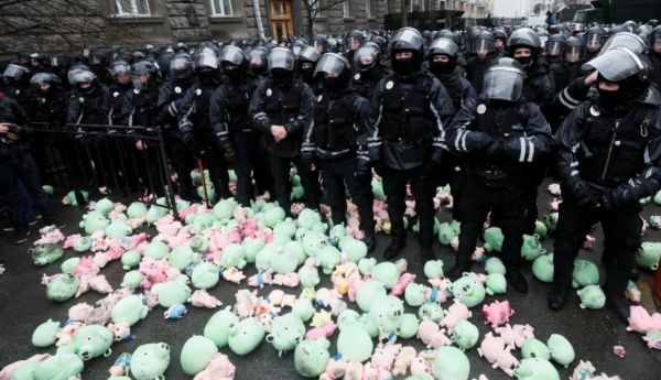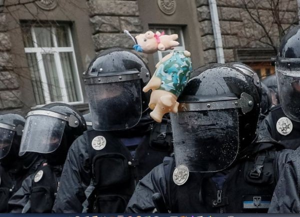 Выяснилось и назначение мега-рогатки. Ею действительно стали стрелять в полицию, бесчисленными рядами перегородившую подходы к резиденции Порошенко. Правда, и в этом проявилось влияние «декоммунизации». Обстреливали «сатрапов» не «коктейлями», носящими имя сталинского наркома, и даже не «оружием пролетариата», а… розовыми и зелёными плюшевыми свинками, которых массово раздавали участникам «акции по жёсткому давлению на власть».