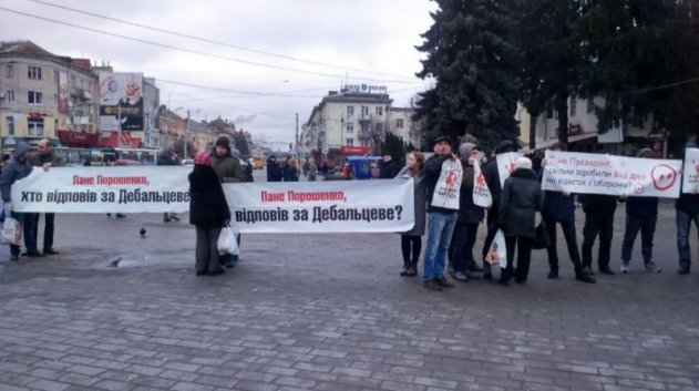 Информация о времени приезда президента была крайне противоречивой. Изначально говорили, что Порошенко прибудет в Луцк к 11 часам утра, поэтому к этому времени на Театральной площади собралось уже внушительное количество народа. Люди подготовились «тепло» встречать президента. Вся площадь буквально пестрела плакатами с неудобными вопросами: «Сколько заработали ваши друзья на откатах с оборонки?», «Кто ответил за Дебальцево?» и «Я не выбираю мародёра», был и лозунг «Первый срок вместо второго термина». Ближе к обеду человек десять «порохотитушек» всё-таки пробились в толпу и порвали несколько плакатов, но их быстро оттеснили превосходящие силы лучан.