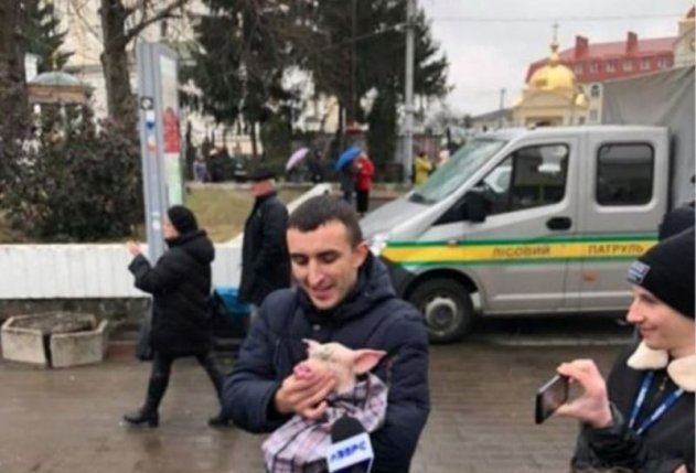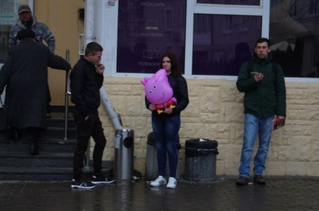 На площадь притащили наскоро сооружённую деревянную плаху, пилы и топоры, намекая на обещание президента отрубить руки участникам коррупционного скандала в «Укроборонпроме». Сюда же принесли маленького очаровательного поросёнка, которого нарекли Свинарчуком в честь одного из участников вышеупомянутого скандала Олега Гладковского (Свинарчука), и собирались торжественно вручить Порошенко. По той же причине люди пришли с воздушными шариками в виде свинки Пепы. «Холопов» с выражением щенячьего восторга на лицах по случаю приезда «пана президента» почти не было, в основном народ был хмур – уж очень все устали от произвола власти.