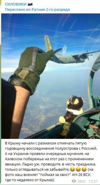 Там же он посоветовал украинским летчикам: «Оглядываться не забывайте». Так военкор подписал фото, на котором, как утверждается, российский военный летчик «поймал за хвост» украинский самолет АН-26 в небе «где-то недалеко от Крыма».