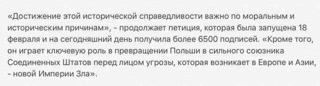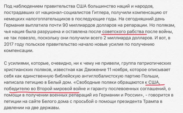 Итак, фабула нашей сегодняшней истории такова: коалиция польских патриотов и христиан подала петицию в поисках помощи от президента США Дональда Трампа в обеспечении репараций за Вторую мировую войну от Германии и России, которые буквально «уничтожили и поработили польскую нацию» во время и после войны.