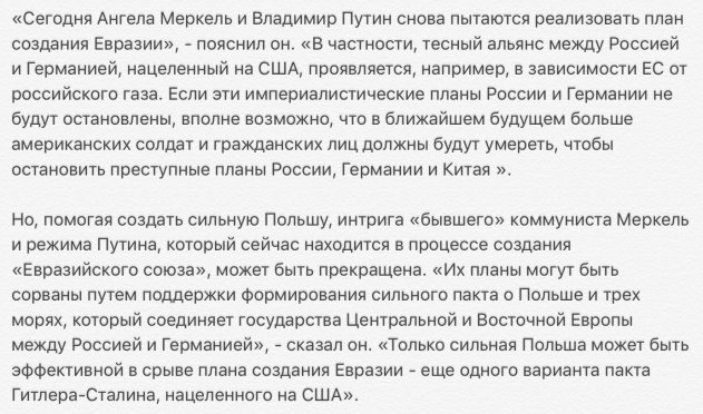 Например, деньги, полученные от «бывшего» коммуниста Меркель и «режима Путина», сыграют ключевую роль в превращении Польши в сильного союзника Соединенных Штатов перед лицом угрозы, которая возникает в Европе и Азии, — новой Империи Зла». Да, вот именно так и никак иначе!