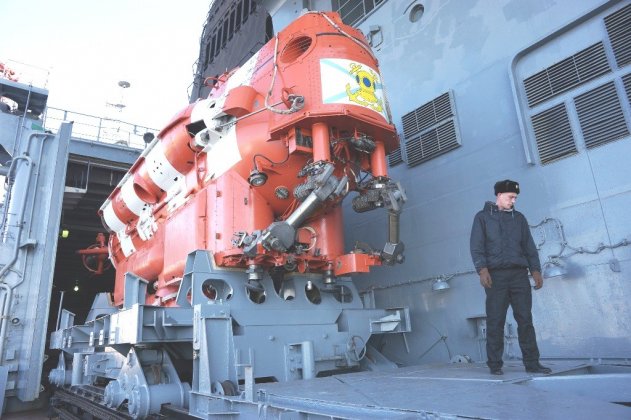 Погрузка современного глубоководного батискафа «Бестер -1» на борт спасательного судна «Алагез» (2016. ТОФ)