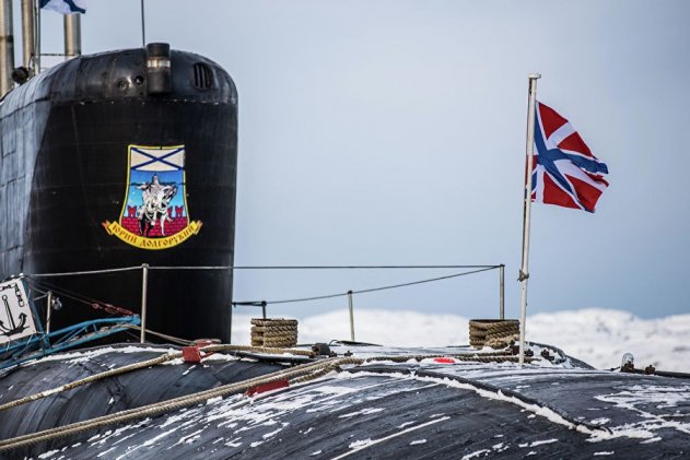 Атомная подводная лодка К-114 «Тула» у причала военно-морской базы Северного флота России в городе Гаджиево