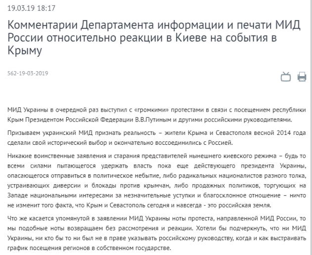 18 марта Путин посетил Крым. Позднее в связи с этим украинская сторона выразила протест и направила соответствующую ноту Министерству иностранных дел России. В ходе поездки, выступая перед представителями общественности Крыма, глава государства в том числе задал вопрос властям в Киеве на украинском языке.
