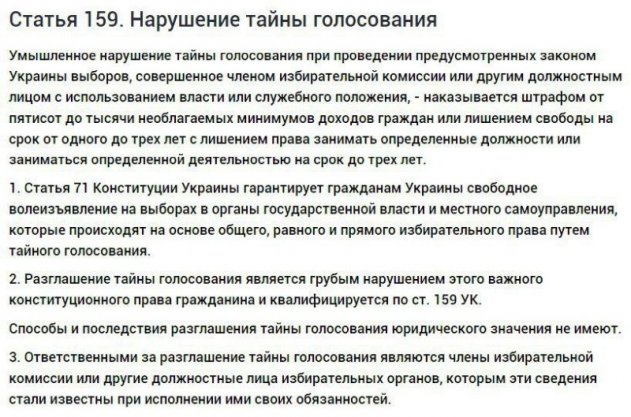 «Граждане Украины, вы не имеете права фотографировать свой избирательный бюллетень, вы не имеете права демонстрировать его во время голосования! Никаких селфи в кабинках», — подчеркнул Варченко. Он уточнил, что за подобный «отчёт» избиратель может понести уголовное наказание в рамках статьи 159 УК Украины (Нарушение тайны голосования) и предложил избирателям ознакомиться с текстом данной статьи Уголовного кодекса.
