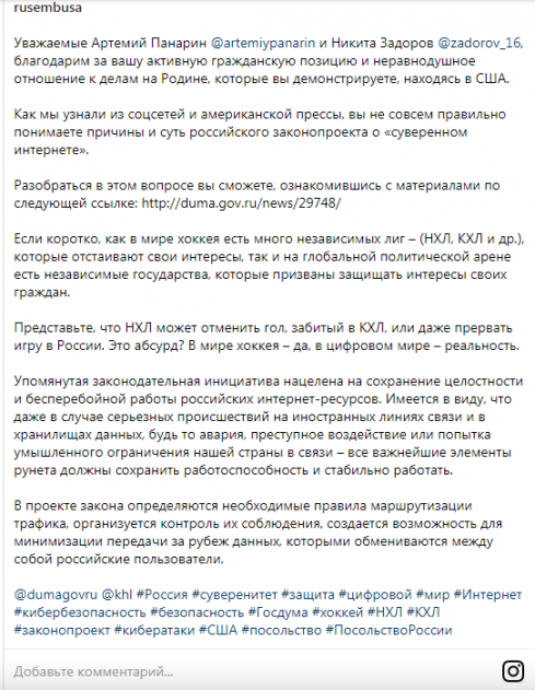 "Уважаемые Артемий Панарин и Никита Задоров, благодарим за вашу активную гражданскую позицию и неравнодушное отношение к делам на Родине, которые вы демонстрируете, находясь в США. Как мы узнали из соцсетей и американской прессы, вы не совсем правильно понимаете причины и суть российского законопроекта о "суверенном интернете", - говорится в опубликованном российской дипмиссией посте в Instagram.