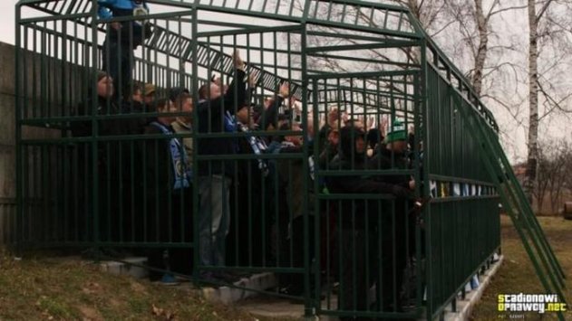 На прошлой неделе приблизительно 100 болельщиков "Хутник Краков" сопровождали свою команду на игре на выезде против "Спартакус Далешице" в третьем футбольном дивизионе Польши, они оказались запертыми в большой металлической клетке на все 90 минут игры. Согласно польским правилам, болельщики команды гостей должны находиться отдельно от поклонников команды, принимающей игру, но обычно это происходит в изолированном секторе стадиона или в фиксирующейся зоне, отделённой высоким забором, чтобы избежать ожесточённых столкновений. Однако "Спартакус Далешице" – одна из нескольких польских команд, которые решили разместить поклонников отдельно в металлической клетке. Спорная конструкция на самом деле существовала там в течение многих лет, но только недавно привлекла внимание после размещения фотографий, которые быстро распространились онлайн, на популярном польском веб-сайте футбольных болельщиков.