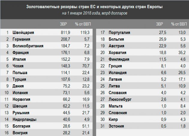 На мой взгляд, уверенно чувствует себя Швейцария, у которой золотовалютных резервов почти на 20 процентов больше, чем ее ВВП. А также некоторые азиатские «тигры» — Гонконг (137,5% ВВП), Сингапур (93,2) и Тайвань (82,1). Россия по этому показателю середнячок. Из общего списка я вычленил страны Евросоюза, но прибавил к ним Швейцарию, Норвегию и Исландию, которые членами ЕС не являются. Но все равно — Европа.