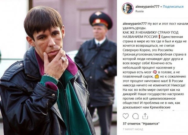 По его словам, Россия - это "грязная, уголовная, гомофобная страна, в которой люди ненавидят друг друга и всех вокруг себя" и в которой "никогда ничего не изменится".
