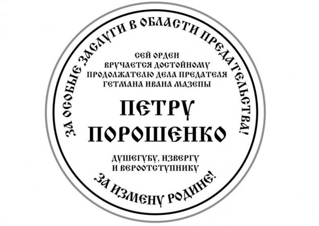 «Мы следим за процессом изготовления награды для Петра Порошенко и очень ждем, когда можно будет вручить ему заслуженный «Орден Иуды» за разрушенные дома, потерянных родных и близких, чтобы он ощутил на себе всю боль жителей Донбасса», — добавила помощник секретаря отделения ОД «ДР» в Горловке Виктория Жукова.