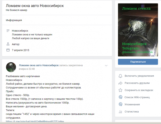 В социальной сети «ВКонтакте» появилось сообщество «Ломаем окна авто Новосибирск». За символическую сумму в 500 рублей администрация группы предлагает разбить окно в машине. Как говорят сами авторы проекта, сотрудничать они готовы как с простыми работягами, так и с коллекторами.