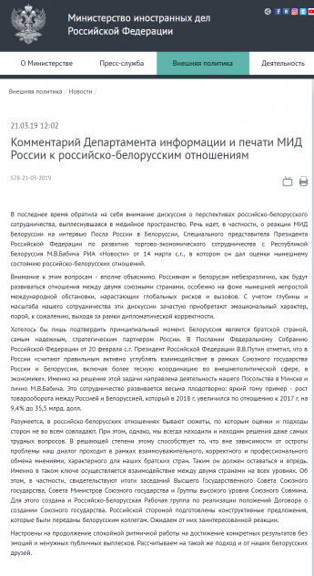 Хотелось бы лишь подтвердить принципиальный момент. Белоруссия является братской страной, самым надежным, стратегическим партнером России. В Послании Федеральному Собранию Российской Федерации от 20 февраля с.г. Президент Российской Федерации В.В.Путин отметил, что в России «считают правильным активно углублять взаимодействие в рамках Союзного государства России и Белоруссии, включая более тесную координацию во внешнеполитической сфере, в экономике». Именно на решение этой задачи направлена деятельность нашего Посольства в Минске и лично М.В.Бабича. Это сотрудничество развивается весьма плодотворно: яркий тому пример - рост товарооборота между Россией и Белоруссией, который в 2018 г. увеличился по отношению к 2017 г. на 9,4% до 35,5 млрд. долл.