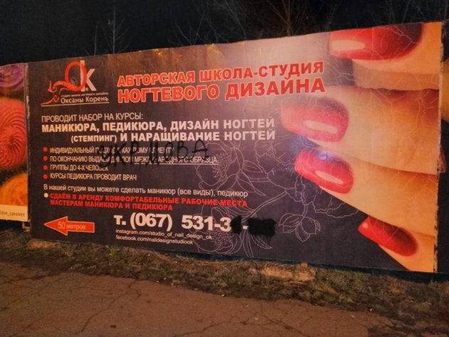 Боевики из националистической группировки С14 разрисовали бигборды с рекламой на русском языке в Кременчуге Полтавской области.