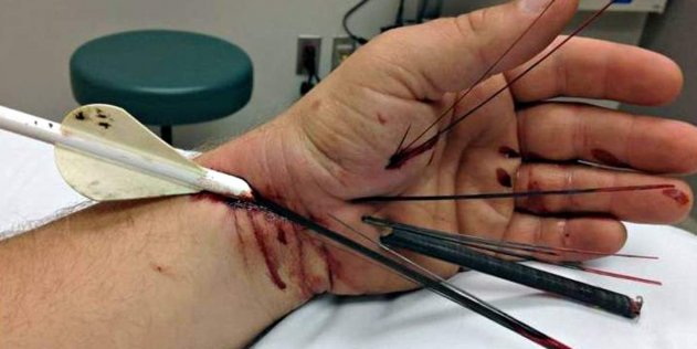 Если стрела ломается во время выстрела, её обломок может попасть лучнику в левую руку