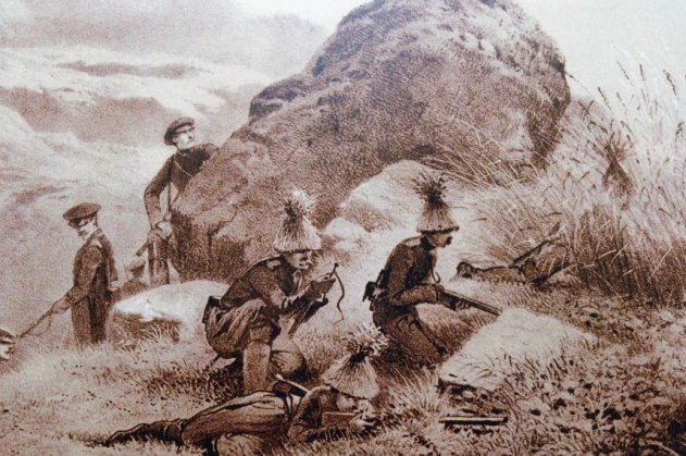 Репродукция. «Русские пехотинцы в засаде» — экспонат историко-документальной выставки, 1853–1856 гг.