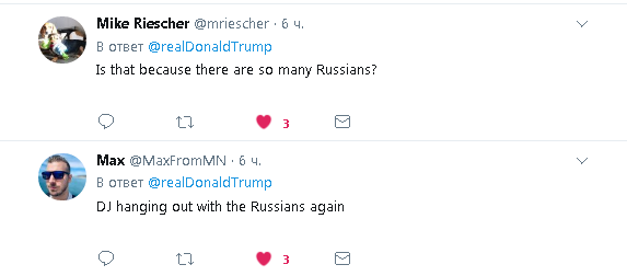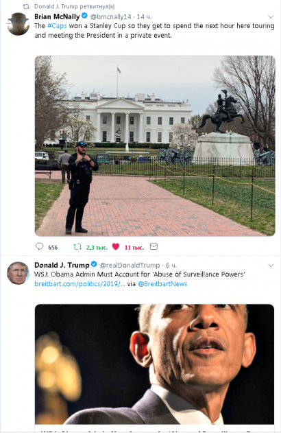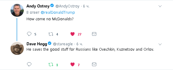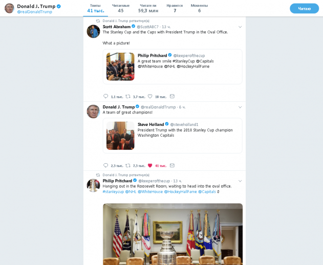 Не прошло и суток после официального объявления завершения расследования русского сговора, которое вел спец. прокурор Мюллер, как Трамп дал повод к открытию нового. Видимо, почувствовав себя бессмертным после закрытия следствия, Трамп, со слов Изабель Хурдушьян, признался, что является фанатом российского хоккеиста Александра Овечкина, назвал Александра "нечто особенное" и рассказал, что его дочь Иванка "большой друг и поклонник Александра Овечкина". В итоге, в в своем Твиттер-е Трам сделал три репоста об этой встрече, написав "Команда великих чемпионов!", а четвертый репост был посвящен уже только члену Команды Путина, хоккеисту Александру Овечкину