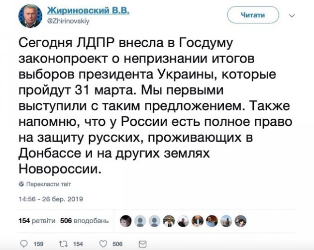 В Госдуму внесён законопроект о непризнании итогов выборов президента Украины. Инициатором выступила партия ЛДПР Владимира Жириновского.