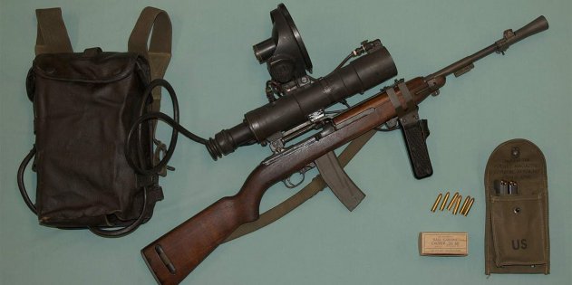 В карабине М3 с ночным прицелом нет почти ничего извращённого… кроме облика! Реальное оружие конца Второй мировой выглядит фантастическим бластером из дешёвого боевика 80-х. Японцы на Окинаве успели оценить новинку — их любимая тактика «подкрасться ночью» переставала работать совсем.