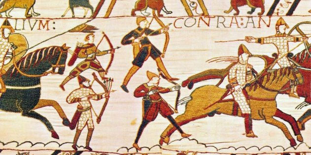 Огромный гобелен из Байё, который подробно изображает подготовку нормандского вторжения в Англию и битву при Гастингсе (1066), создали в 70-е годы XI века. Изображений арбалетов на нём нет, и письменные источники прямо не говорят о них. Но известно, что в армии Вильгельма были лучники, причём луки там использовались короткие, а не лонгбоу.