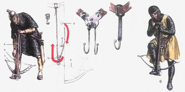 Справка. Для взвода арбалетов с XIV века также применялся «оспье» — длинный рычаг с зацепом, установленный на вертикальной стойке. Однако его можно использовать только стационарно — в крепостях и на кораблях. В полевых сражениях он не встречался.