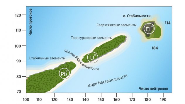 Чтобы химический элемент был стабилен, в его ядре должно быть "магическое" соотношение протонов и нейтронов. Последние открытые сверхтяжелые элементы, включая 118-й, и предполагаемые 119-й и 120-й, лежат вне острова Стабильности