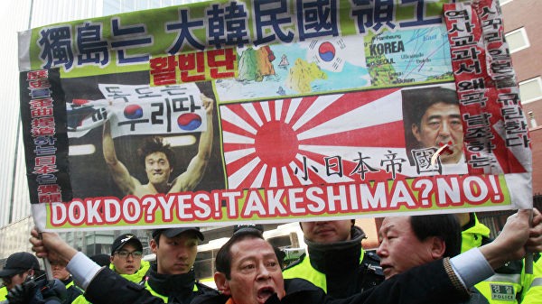 Акции протеста против "Дня Такэсимы" напротив посольства Японии с Сеуле, Южная Корея. 22 февраля 2014 "Это Япония считает, что у нее есть территориальные проблемы с Россией. Мы готовы на этот счет разговаривать", — объяснил позицию Кремля в 2017-м Владимир Путин.