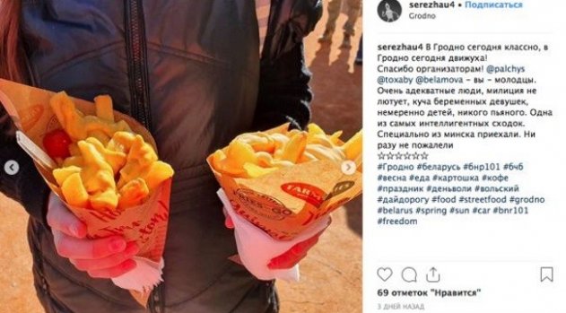 «В Гродно сегодня классно, в Гродно сегодня движуха!», «Круто!», «Отдохнули на славу!» – строчили БЧБ-инстаграммеры, не забывая сопровождать фотографии с символикой тегами #еда, #картошка, #отдых, #весна, #праздник. И тут же ненавязчиво – #бнр101, #бчб #деньволи. Годовщина БНР прилагалась к весёлому весеннему мероприятию с песнями и уличной торговлей.