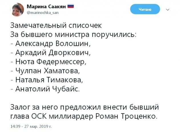 26 марта, стало известно об аресте бывшего министра «открытого правительства» Михаила Абызова.