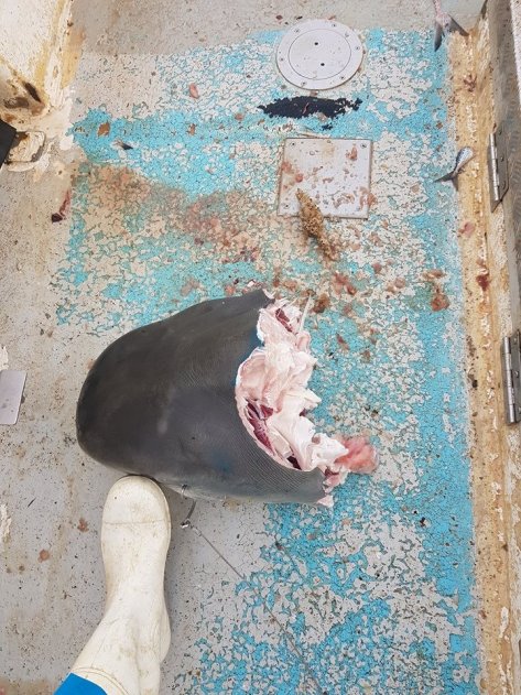"К сожалению, мы не видели, кто ее съел, но он явно был внушительных размеров. Голова акулы весила около 100 килограммов", — говорится в подписи к фото.