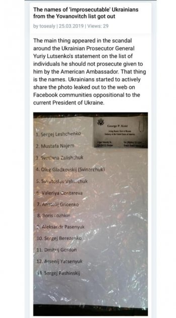 Обнародован список так называемых неприкасаемых для расследований лиц, который якобы был передан американским послом Мари Иованович генеральному прокурору Украины Юрию Луценко.