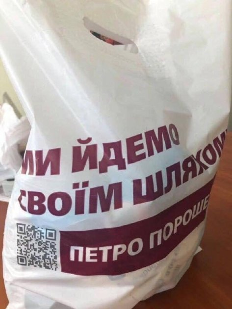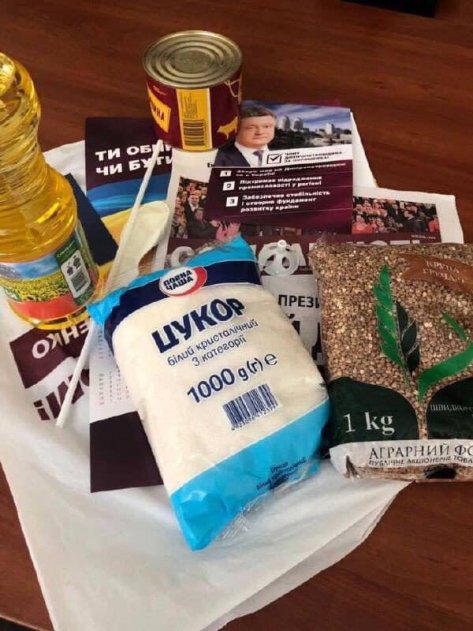 Так, на опубликованных фотографиях виден продуктовый набор из подсолнечного масла, гречки, сахара, и тушенки вместе с предвыборной листовкой Порошенко.