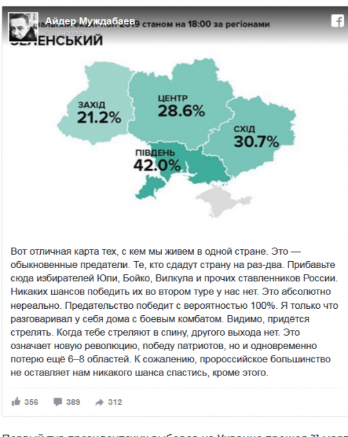 Журналист назвал предателями всех, кто не голосовал за Порошенко и отметил, что шансов на победу во втором туре у теперешнего гаранта нет. Единственный выход — убивать представителей пророссийского большинства жителей Украины, написал Муждабаев.