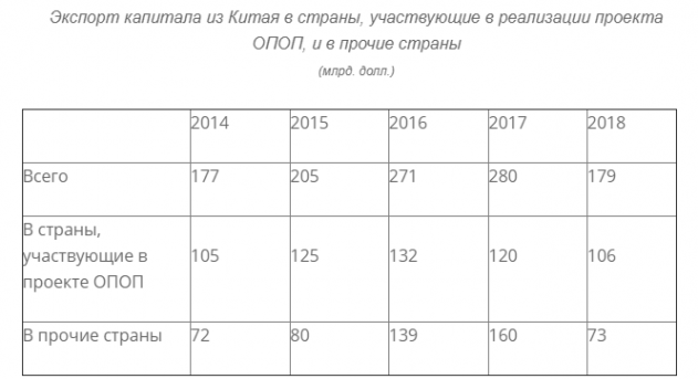 Цифры, приводимые в докладе, не вполне совпадают с теми, которые даёт ЮНКТАД. Видимо, авторы включают в рубрику «инвестиции» не только прямые, но также портфельные и прочие (кредиты и займы) инвестиции. Авторы доклада делят экспорт капитала на две части – та, которая была направлена в страны, участвующие в реализации ОПОП, и остальные страны (см. табл.)