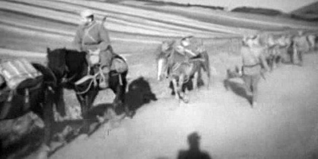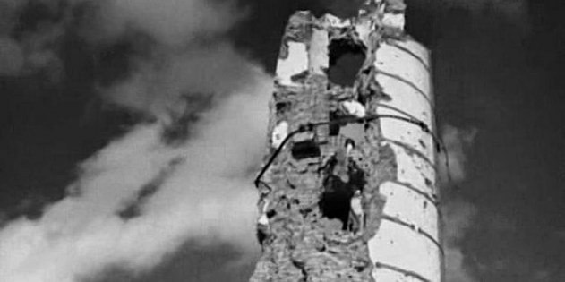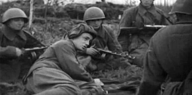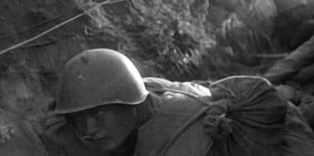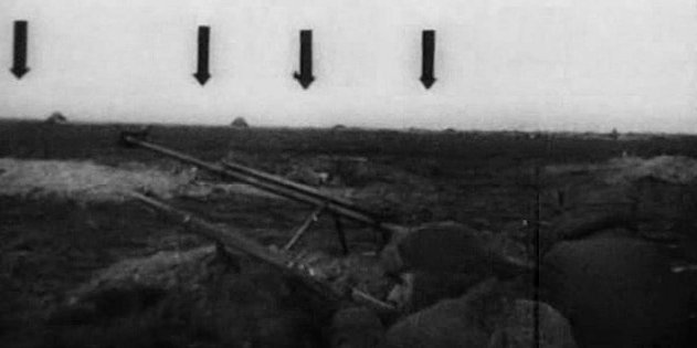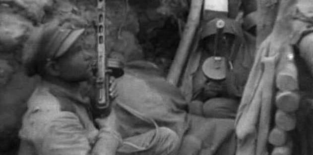 На экране — глубокие траншеи, недавно отбитые у немцев. Наверху — ожесточённая дуэль артиллерии. Бойцы вжались в «лисьи норы». А оператор должен работать… И он снимает сплошную пелену дыма с разлетающимися обломками.