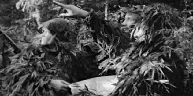 А вот разведчики, невидимые в лесу, идут в тыл врага Никогда раньше не видел настолько качественного камуфляжа в документальном кино. Да и в художественных фильмах советские разведчики в маскировочных костюмах «амёба» появлялись разве что в старой «Звезде» 1946 года.
