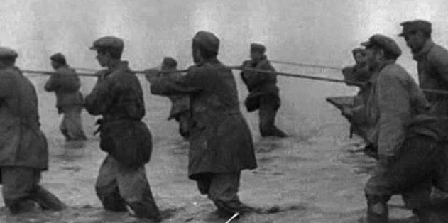 Восьмое-десятое апреля — освобождение Крыма, Сиваш. Бойцы тащат за собой лодки по солёному ледяному месиву и ручной «бабой» забивают сваи.