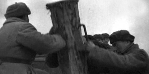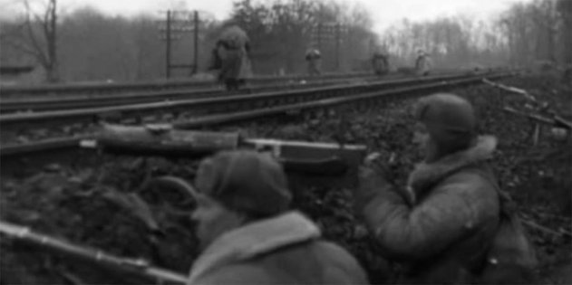 Бой на полотне железной дороги — последние кадры, снятые капитаном Владимиром Сущинским. Двадцать второго февраля 1945 года рядом с ним разорвался снаряд. Похороны друга и напарника снимал другой фронтовой оператор — Николай Быков.