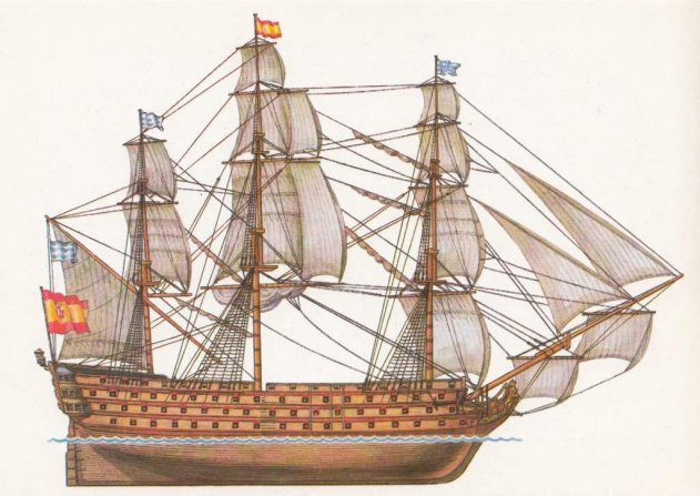 Испанские кораблестроители украшали свои корабли более скромно, чем остальная Европа. Испанцы здраво рассудили, что, в конце концов, главное достоинство боевого корабля - это мощность его орудий, скорость и маневренность. Но, в отличие от англичан, испанцы рассматривали военные корабли всего лишь как боевые платформы для солдат и орудий. Боевая тактика испанцев сводилась к тому, чтобы меткими залпами снести мачты вражеских кораблей и, взяв подбитое судно на абордаж, разграбить его. Эта часто приводило к тому, что дисциплина на испанских кораблях отсутствовала, что и было одной из причин постоянных поражений Испании.