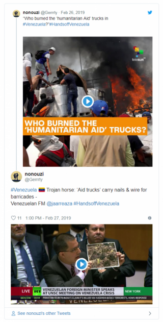 Но Россия является союзником Венесуэлы, так почему бы не отразить это в Твиттере, когда западный агрессор пытается навязать свою военную и экономическую волю Венесуэле? Такова была ситуация в феврале, когда США пытались оказать давление на правительство Венесуэлы, чтобы те впустили в страну грузовики, предположительно с гуманитарной помощью. Помощь в качестве троянского коня для оружия имеет исторический контекст, особенно в отношении США и их нового специального посланника в Венесуэле Эллиота Абрамса , осужденного военного преступника, который незаконно поставлял оружие эскадронам смерти в Никарагуа, Сальвадоре и Гватемале от имени президента Рейгана в 1980-х годах. Теперь, когда он является специальным посланником в Венесуэле, есть здравый смысл в том, чтобы подозревать нечестную игру. Могут ли такие люди действительно рассматриваться как миротворцы?, Team East Stratcom? И использование рисунка в Твиттере для отвлечения внимания от вопиющей попытки государственного переворота агрессивной силой более чем немного презренно. Более того, через несколько дней в одном из грузовиков, перевозящих припасы, были обнаружены гвозди и другие материалы, полезные для изготовления баррикад: