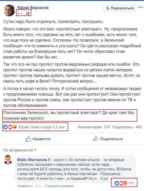 Помощник министра обороны Украины и советник Порошенко Юрий Бирюков, хорошо известный в соцсетях как «Крылья Феникса», подводя итог первому туру президентских выборов, заявил пяти миллионам украинцам, проголосовавшим за Зеленского: «Хрен вам, мы покажем вам протест»
