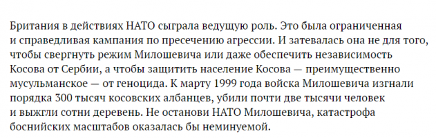 Британское издание обвиняет Россию в том, что она незаконно поддерживала сербов в войне за Косово в 90-е годы и сейчас пытается разжечь антизападные настроения своим фильмом. Косово признали независимым краем американская администрация и британское правительство, значит, все законно. Кремлю следует отступиться и перестать заниматься пропагандой.