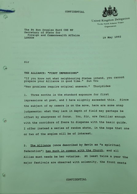 Вскоре после своего назначения постоянным представителем Великобритании в НАТО сэр Джон Уэстон поделился своими «первыми впечатлениями» о проблемах, стоящих перед НАТО, с тогдашним министром иностранных дел Великобритании Дугласом Хердом.