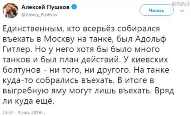 На своей странице в Twitter Пушков написал, что Адольф Гитлер был единственным, кто всерьез собирался въехать в Москву на танке. Но у Гитлера было много танков и план действий. А у болтунов из Киева нет ни того, ни другого. "В итоге в выгребную яму могут лишь въехать", — цитирует слова Пушкова РИА Новости.