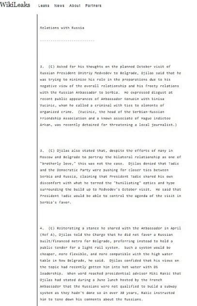 В архивах Wikileaks обнаружены закрытые данные дипломатической почты посольства США, раскрывающие антироссийские взгляды верхушки оппозиционного «Союза за Сербию», который уже несколько месяцев пытается спровоцировать начало масштабного Майдана в Белграде.