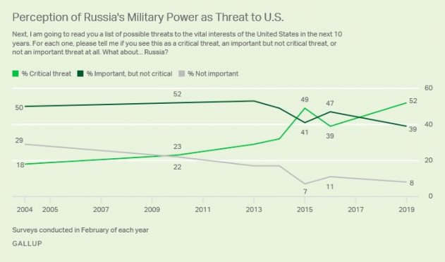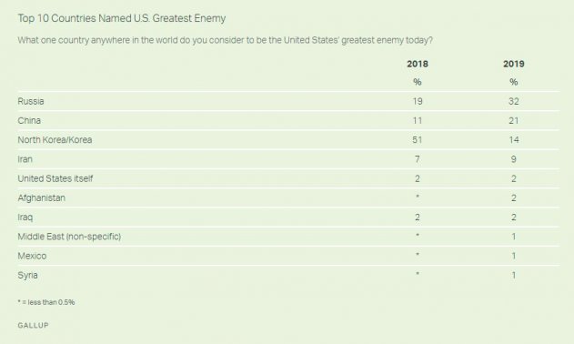 Уже несколько лет каждый февраль «Гэллап» проводит соцопрос, кого американцы считают своим врагом №1. В этом году Россия прочно укрепилась на первом месте, обогнав даже Китай, Северную Корею и Иран. Ну, нам не привыкать.